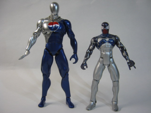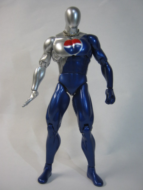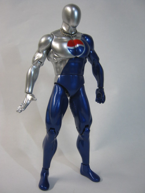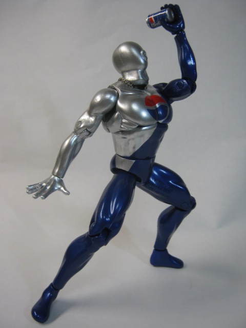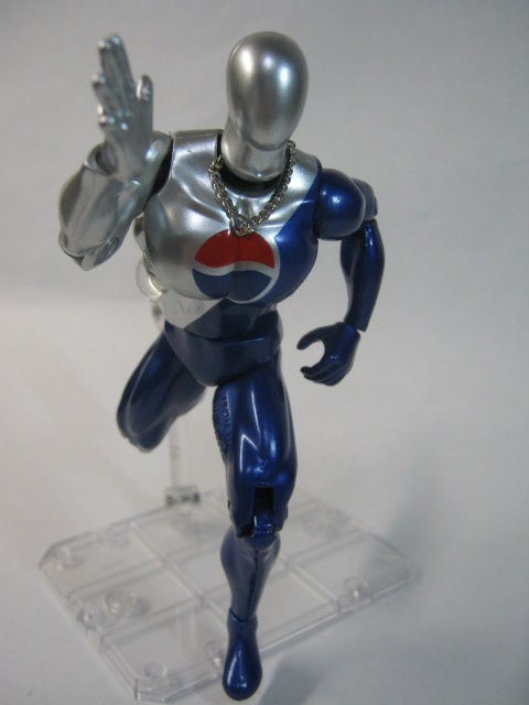 ペプシマンメタリックブルーの塗装が綺麗で見事なまでのタイツマッチョ。ペプシマンの見た目は複数存在し、今回は1998年頃からリニューアルした新デザインであり一番馴染みのあるコスチュームで登場。当時付属したボトルキャップ等もこのデザインでしたね。右手が平手、左手が持ち手になxっています。
