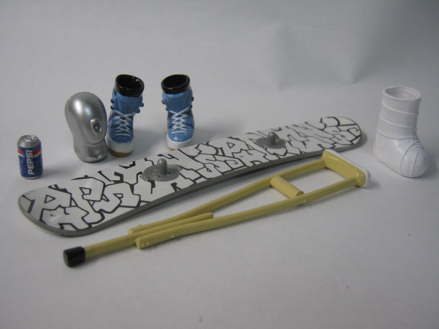 オプションパーツ一覧。先述の頭部の他にペプシ缶、スノーボード、松葉杖にシューズ、包帯が付属。