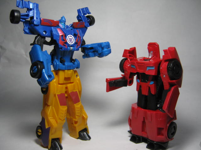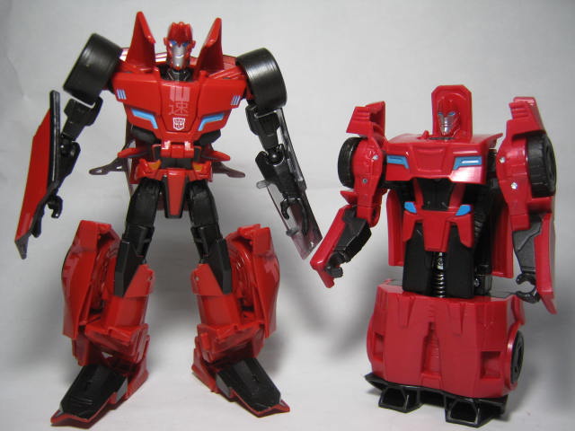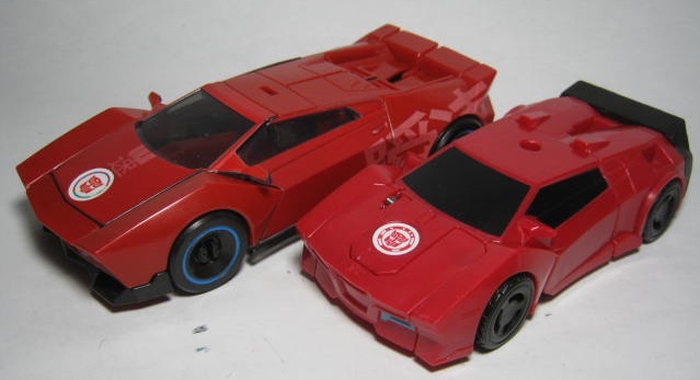 比較デラックスクラス相当のウォーリアークラス版と。ビークルモードだと「瞬速」ペイントの省略が目立ちますね・・・。ロボットモードだと配色が合わせてあるのもあり、割と似ている印象。