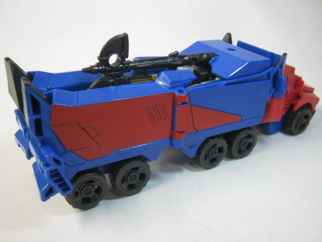 武器をコンテナ上部に収納可能。パッケージ裏の説明書のは載っていなかったりします。後輪付近を持ってしまうとコンテナが左右に分離しやすいのがちと残念。何気に合計10個のタイヤ全てがダミー無しで回転するのは凄いかも。劇中ではコンテナ後部にオートボットのエンブレムがありました。