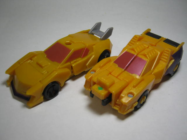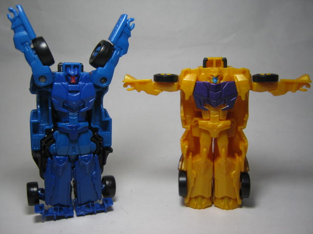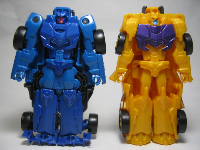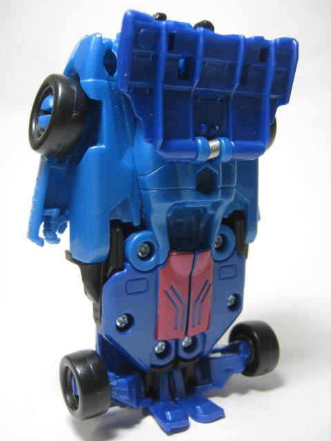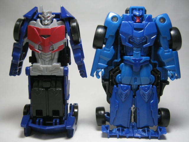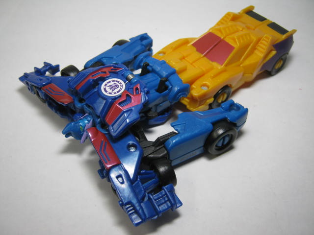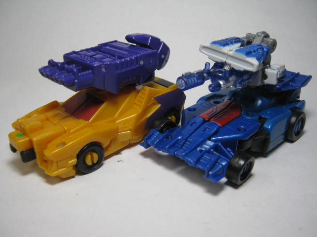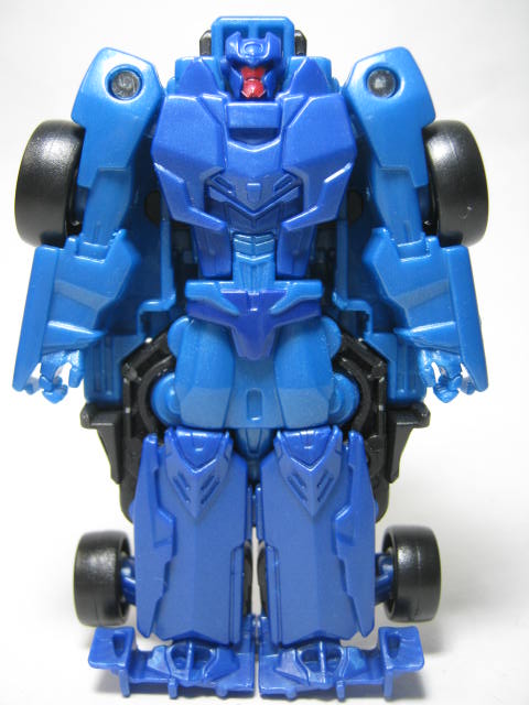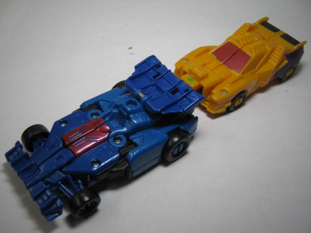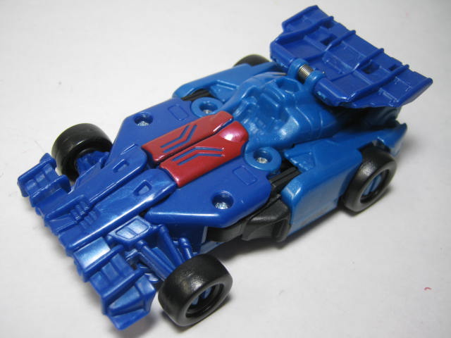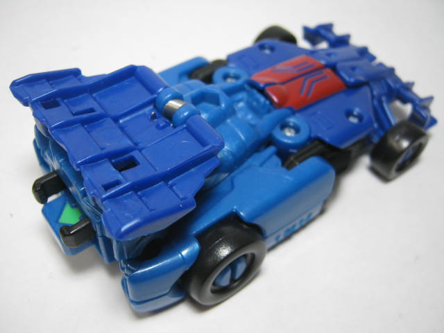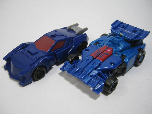 青いF1カーに変形。アニメでは青いスポーツカーに変形していたのですが、玩具だと何故かF1カーに。既にお気付きだと思いますが、この商品、何故かワイルドブレークとドラッグストリップの型が入れ替わっています。つまりドラッグストリップ型のワイルドブレークとワイルドブレーク型のドラッグストリップのセットになっているのです。RID本編ですと頭部以外は同型なのですが、クラッシュコンバイナー版ではG1を意識しててか、F1カーとスポーツカーに変わっています。そこまでは良いのですが、何故か色と名前が入れ替わってしまっているのです。
