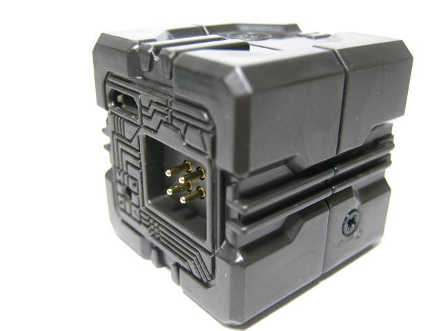 まずは付属のオールスパークキューブ。本シリーズの核となるアイテムで、全対応商品のサウンドがこの中に全て収められています。1作目に登場したキーアイテム、オールスパークが5作目の玩具オリジナルラインでまた出てくるとは思いませんでした。デザインはだいぶ異なってはいますが。内部にバッテリー内蔵。表面にはライトとスピーカー、裏面が充電端子と認識端子が配置されています。このままだと特に何も遊ぶ事は出来ません。認識は特撮玩具等によくある押されるピンの数による方法等と違っている様で、指等で押して誤魔化して遊ぶ、なんて事は難しそうです。全サウンドが聞きたかったら大人しく全部買った方が良さそう・・・。