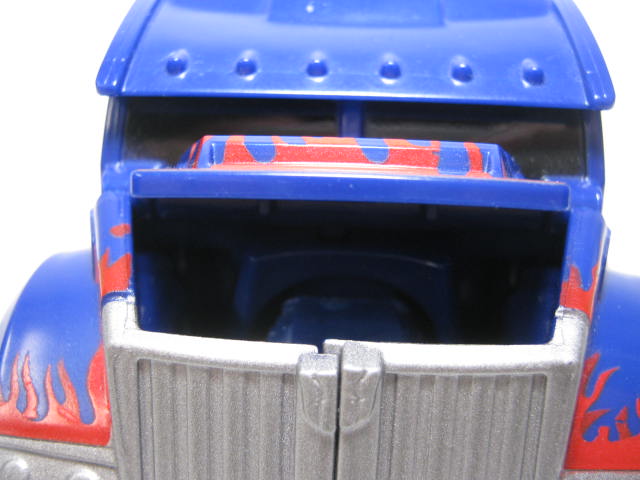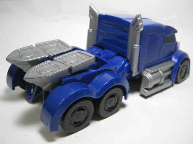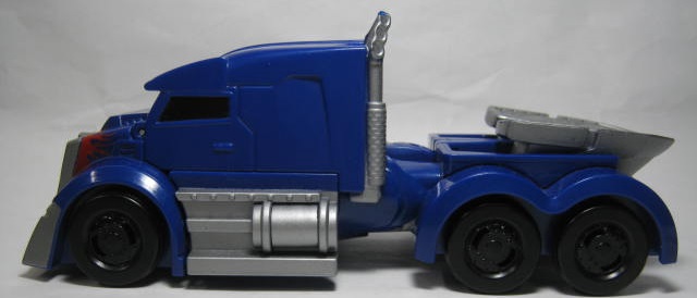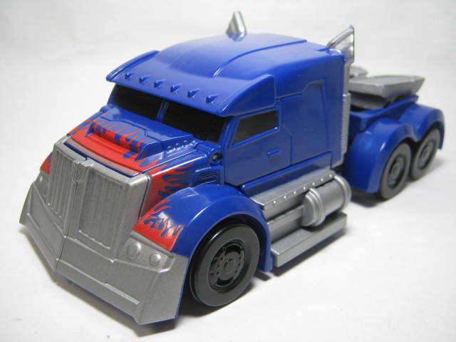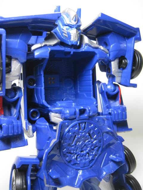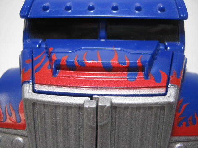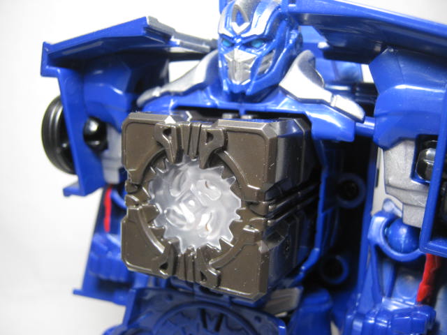 セットした後も胸を閉じる事が出来ます。胸にはライトとサウンド用の隙間があるので、ロボットモードでなら発光を楽しむ事が出来ます。ビークル、ロボット共にギミックは機能します。何もしなくても約6秒置きにセリフをランダムに自動でしゃべる他、キューブをセットする、振る、衝撃を与える、空中に放り投げる、変形させる、ビークルモードで走行させる等のアクションで効果音やセリフを鳴らす事が出来ます。アクションに合わせて色々と効果音がなるのですが、コレが結構楽しい。特にオプティマスは恐らく劇中と同じピーター・カレンさんの声を使用しているので雰囲気がかなり出ています。セリフも「ONE SHALL STAND ONE SHALL FALL!」等のお馴染みのセリフや「YOU ARE MY FRIEND.」等の他の玩具には収録されないようなセリフがあるのが楽しい。