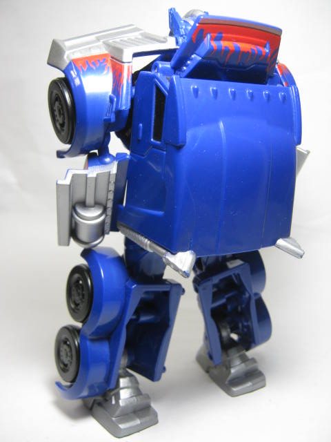ややデフォルメされているのはビークルモード同様。ほぼ寝っ転がっていた感じの変形なのが解ります。肩ががっしりしているのが特徴的。裏からだと足を収納していた空間が目立ちますね・・・。塗装範囲自体は広めですが、胸の模様等は省略気味。ギミックで衝撃を与える事を前提してか、頭部と足は柔軟パーツになっています。