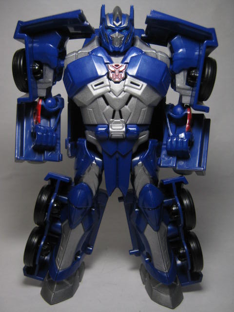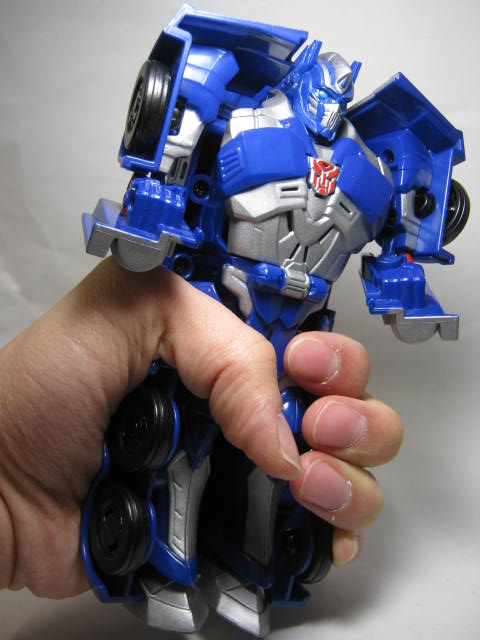 トランスフォーム!肩を広げてボンネット部分の後頭部のパネルを開き、股関節をスライドさせてつま先を曲げれば変形完了!オールスパークテックは殆どのキャラがこの変形パターンの為、変形玩具としては面白みが薄いのが残念な所。特別面白い変形をする訳でもありませんし。