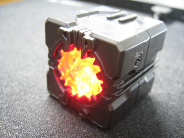ただ、センサーの制度がイマイチなのか結構強めに衝撃を与えないと鳴らなかったり、振っても中々鳴らないと言った事がチラホラ。また、変形時に脚を伸ばすのに、叩きつける事でサウンドが鳴る為、縮んでしまうとか微妙にツメが甘い様な気がします。ちなみに一定時間放置する事でスリープモードになります。再度衝撃を与えるか、キューブをセットし直す等で解除されます。