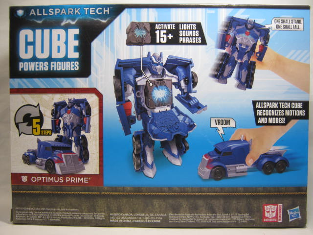 オプティマス本体とは別に、ギミックの中心部分であるオールスパークキューブも目立つように配置されています。裏面には簡単な遊び方等が記載。15種類以上の効果音とセリフを収録している様です。正面に電池のマークがありますが、本製品は充電式なので電池は不要。コチラはスターターセットとしてオールスパークキューブと対応したTFが一体セットになっているモノ。スターターは3種あり、他にはシャドウスパークオプティマススクィークスがあります。