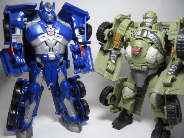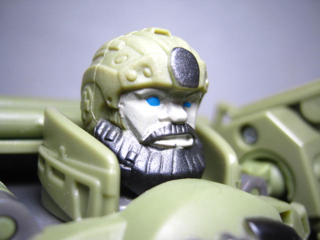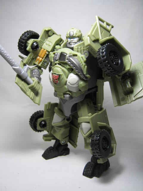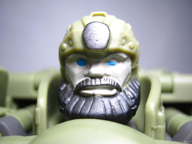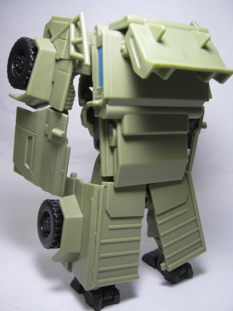 ロボットモード太った軍人の様な姿に変形。ボディが手榴弾の様なデザインになっています。劇中に近いのかはよく解りませんが、他の玩具とは違った独自の解釈で面白い。後ろからみると手足のパネルのおかげでがっしりした体系に見えますが、実際にモールドされている手足は意外と細めです。頭部と足首はオプティマス同様に柔軟素材を使用。