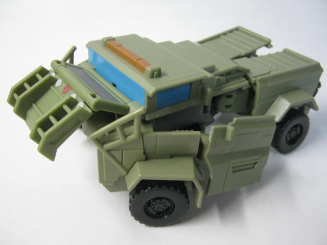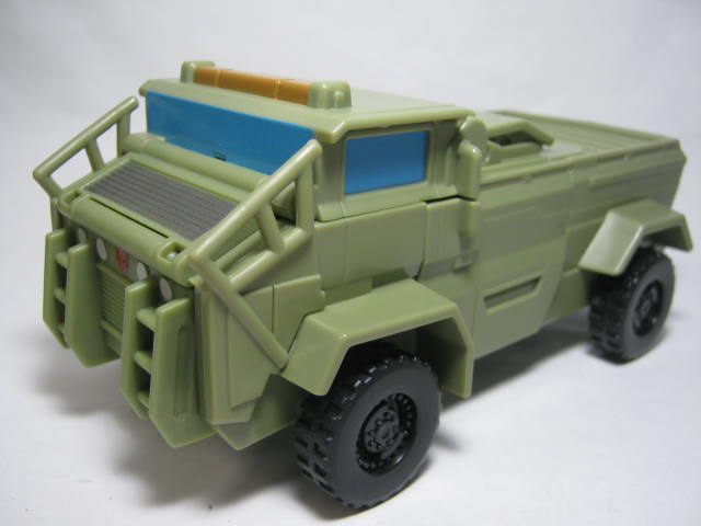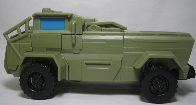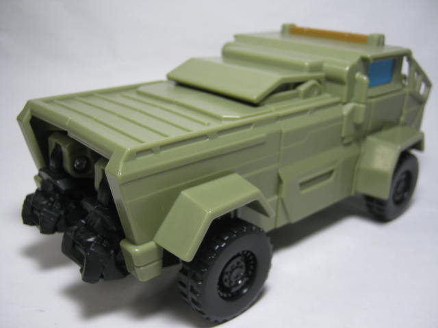 ビークルモード軍用トラックに変形。例によってサブラインの為、ライセンスを取得してない架空ビークルです。最後の騎士王のハウンドの玩具は後部にランチャーが付いているのが基本でしたが、コチラでは珍しく省略されています。フロントウィンドの枠が省略されている為、なんだか安っぽい印象を受けます。