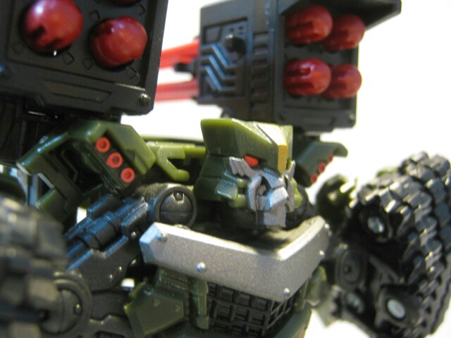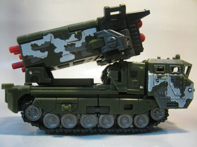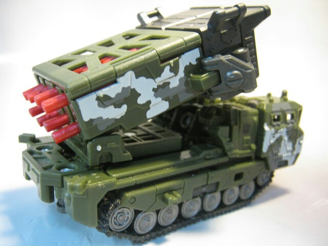 ダークグリーンのボディに黒のキャタピラ、赤いミサイルが素敵です。サイズはデラックスクラスですが、コックピットのサイズ等から考えるにかなり大きいビークルと考えられます。