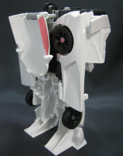 ビークルモード緑のストライプが特徴の白いスポーツカーに変形。G1を意識した外見ではありますが、アレンジは強め。