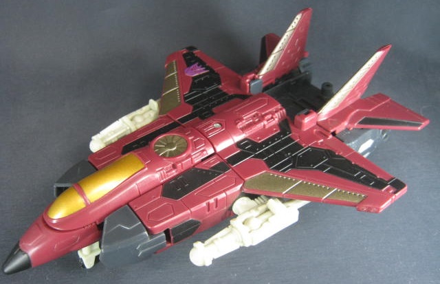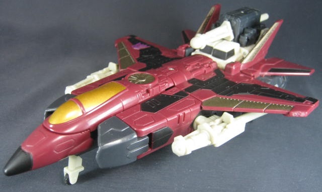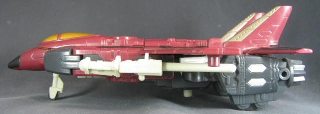 ビークルモード中央にファンの付いた戦闘機に変形。グレーと黄緑のリアル寄りだった通常版から打って変わってそれなりに目立ちそうなG1カラーを意識した外見に変更。マイクロンジョイントは主翼の裏に左右1つずつ、後部に1つ、裏に1つの計4個。スーパーコンの中では平均的な数ですね。