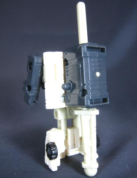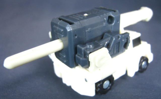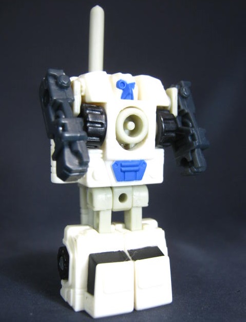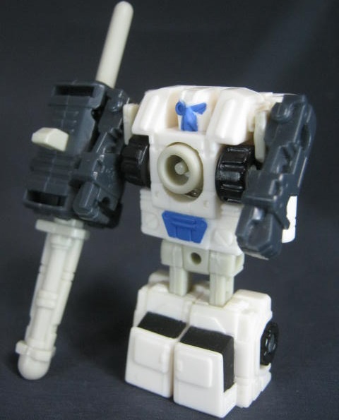 ロボットモードスコープを付けたような右目、箱型な体型とそのまま背負ったミサイルが目立つ姿。手足を展開するだけの、ミニコンにありがちな変形で特にこれといった面白みはありませんね。ミニコン全般に言える事ではありますが、顔つきがそこまでヒロイックで無かったり、通常のTFではあまり見ないようなユニークな顔が多いのが地味に好き。小さいので細かい造形が出来ないというのがあるかもしれませんが、通常TFとは違う種族らしい要素ともとらえられるので好き。