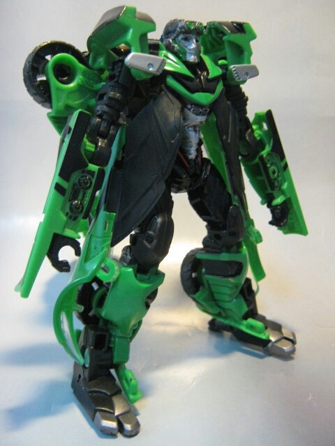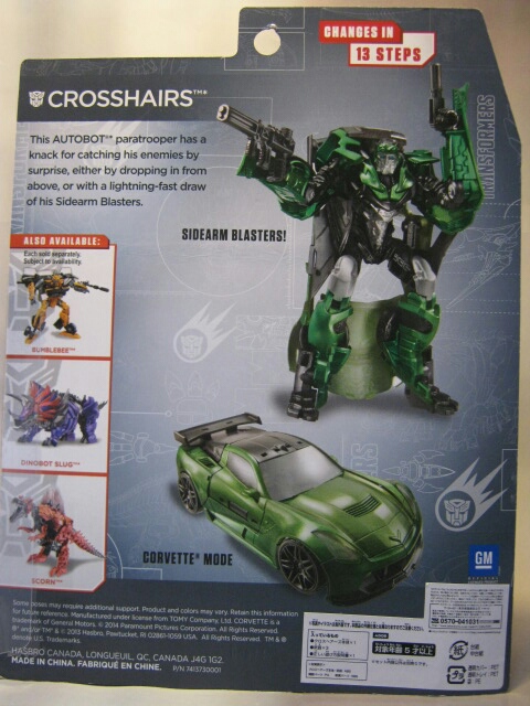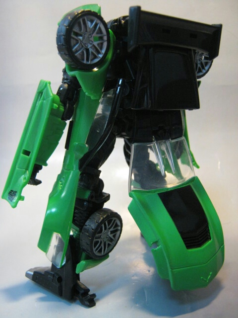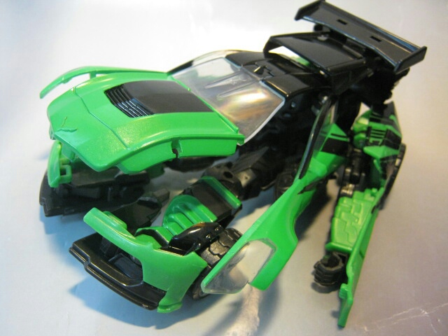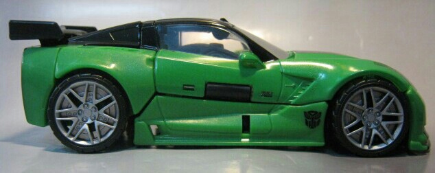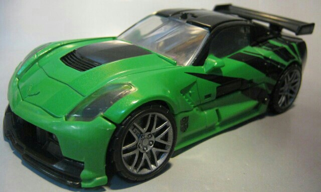 緑のシボレーC7コルベットスティングレイに変形。左側の黒の縞模様が特徴的。窓やライトはクリアパーツになっています。