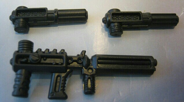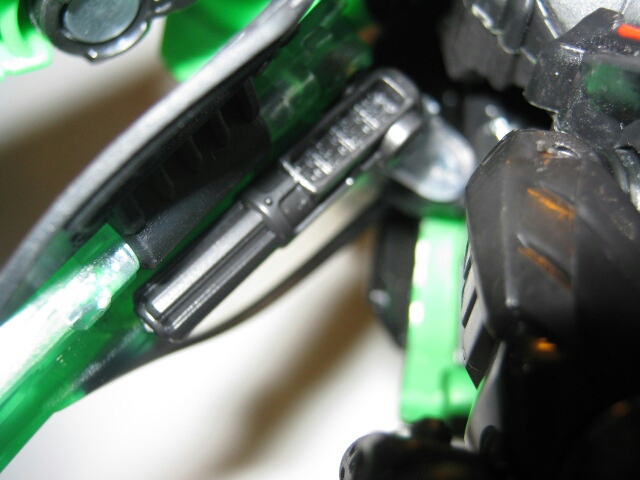 大型のモノは腿に、小型のモノはコートの内側に装備しておく事が出来ます。また、この位置に取り付けたままビークルに変形する事が可能。