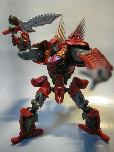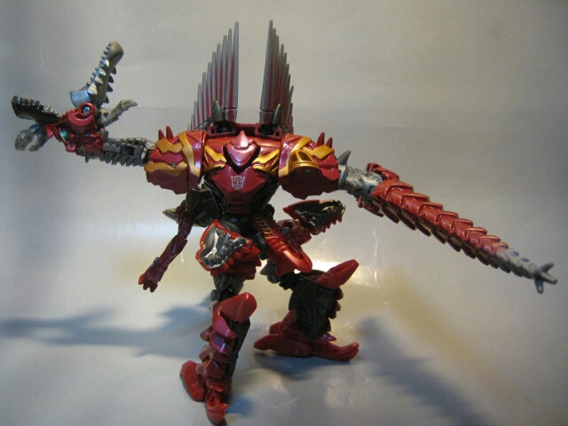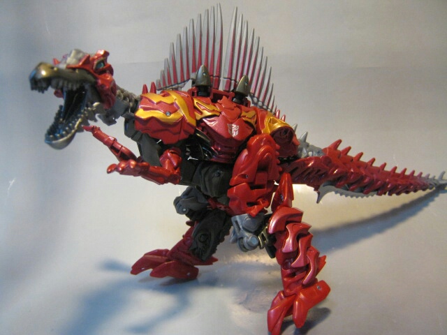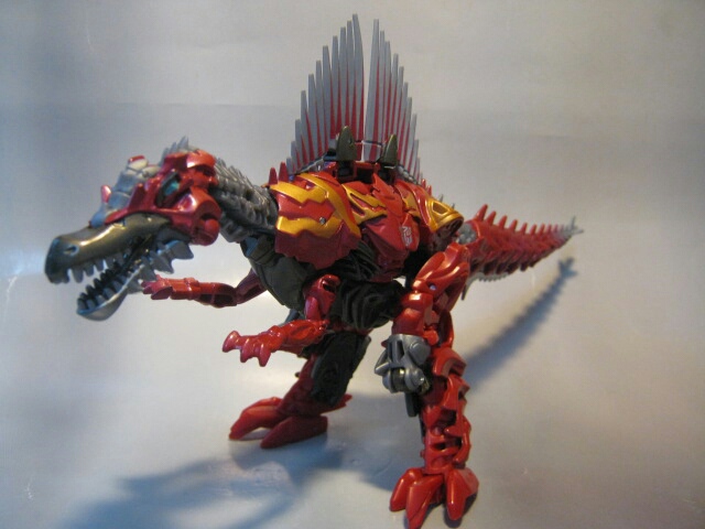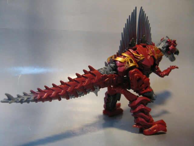 ちょっとメカニカルなデザインのスピノサウルスに変形。国内版であるコチラは赤い部分はほとんどが赤の形成色の上からさらに赤で塗装され、高級感があります。劇中ではダイノボットは皆、銀一色の様ですが、玩具では各ダイノボットの差別化や地味っぽさを防ぐ為か、真っ赤なオリジナルカラーとなっています。尻尾と背鰭は柔軟樹脂製。ちょっとくさい。