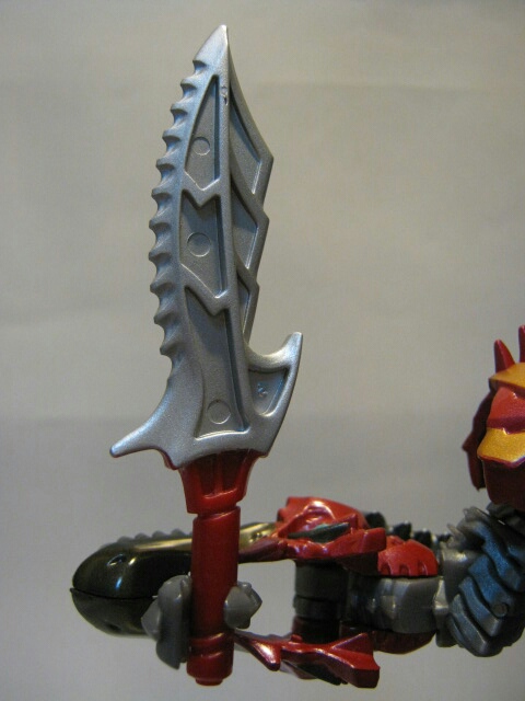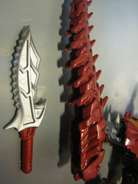 尻尾の中には手持ち武器のナイフが内蔵されており、取り出して右手に持たせる事ができます。変形時以外にもこういったギミックがあるのは嬉しいですね。国内版なので刃が銀で塗装されています。