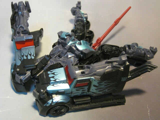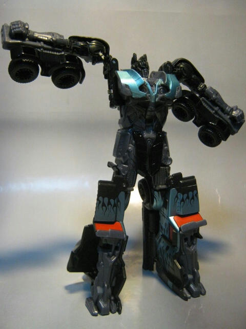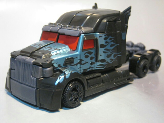 ブラックにエメラルドグリーンのファイアーパターン、赤い窓と黒いオプティマス(コンボイ)でお馴染みのネメシスプライム(ブラックコンボイ)カラーとなっています。海外では普通に赤と青のオプティマスとして出ていたモノのリペイント版で、国内オリジナル品。