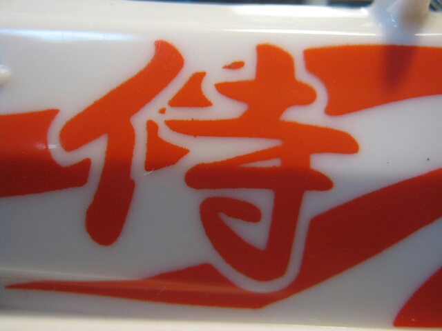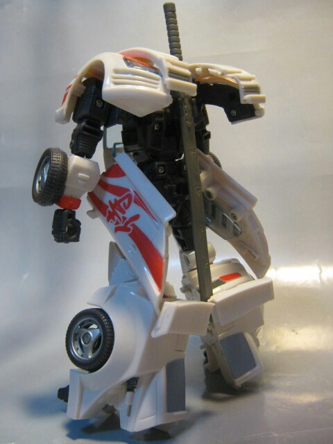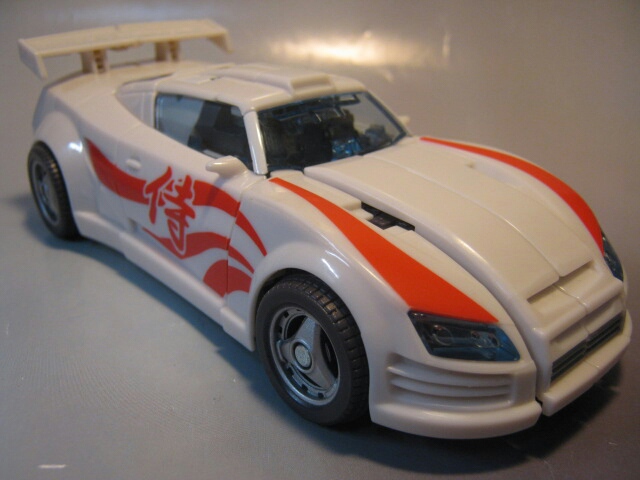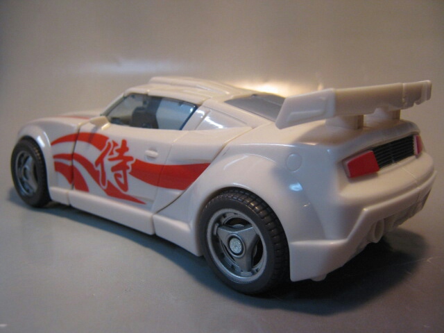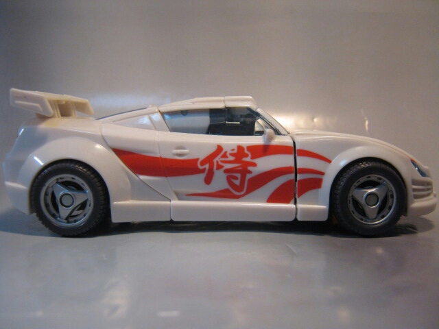 真っ白なボディに赤のペイントが特徴的なスポーツカーに変形。ドアの「侍」の文字が目を引きます。