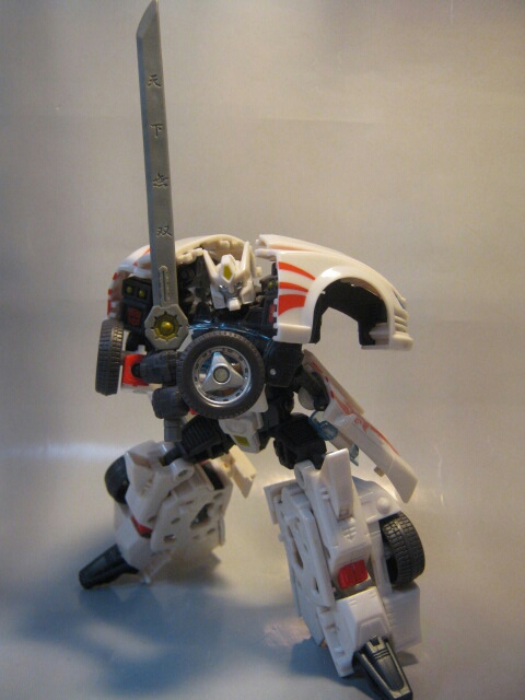 どっしりとした脚、腰に付けられたドア、後へ大きく延びる肩等、どことなく暴走族チックなデザインのロボットモード。背中には大刀、腰のドアには小刀を収納しています。肩のデザインが好きです。