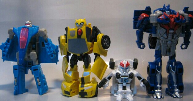 左からビーストウォーズⅡのダージ、アニメイテッド アクティベイターズシリーズのバンブルビー、ボッツショットのプロール、そしてワンステップチェンジャーズのオプティマス。他にもいくつかありますが、とりあえず直ぐに取り出せたモノを並べてみました。どれも違った変形をするので面白いですね。今回のワンステップチェンジャーズやアクティベイターズ、ボッツショット等、一発変形モノはサブラインになりがちですね。