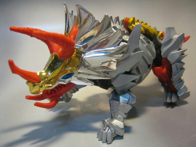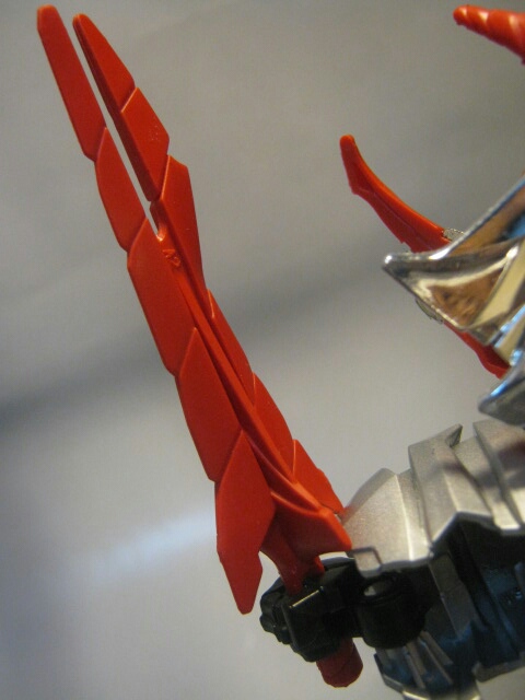 後ろ足を伸ばして脚にし、胴体を腕に。頭部はバックリ左右に開いて肩にします。武器を胴体に刺したままの変形が可能です。