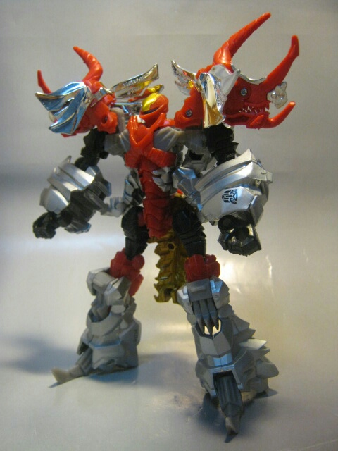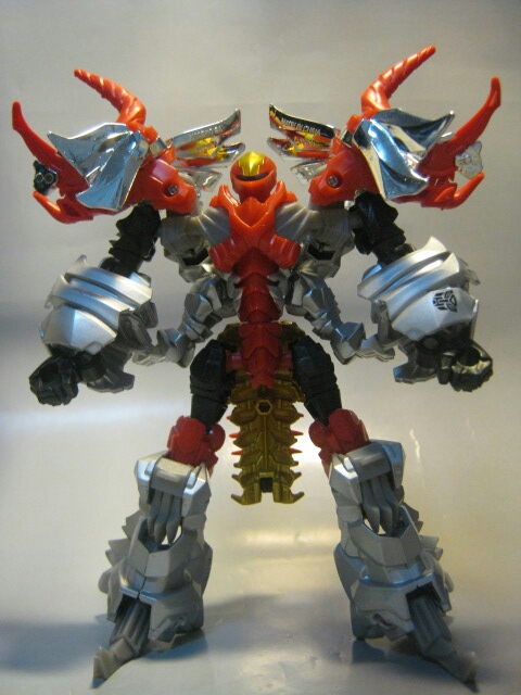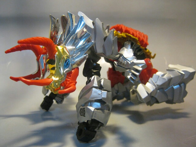 パワフルでマッチョな体型のロボットモード。太い手足と巨大な肩の飾りが特徴的なロボットモード。配色はダイノモードを基準にしていたのでコチラの姿はあまりG1似ではありませんが、色はそのままなのでそれっぽさはあります。