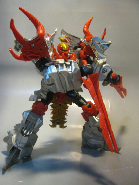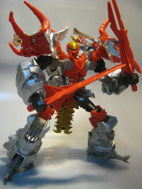 武器のトレイルカッターソードはダイノモードで装備したまま変形させると逆手持ちになりますが、普通に持たせる事も可能。真っ赤。