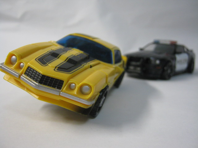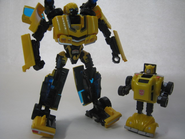 G1バンブルビー(アンコール版)と。こうやって比べてみると共通点は色ぐらいしか無いですねー。劇中だと中古車屋でバンブルビーのすぐ横に黄色のビートルが置いてありニヤリとさせましたね。そのあとドアをぶつけられたのは驚きましたが。