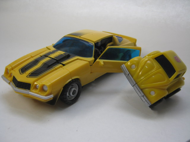 玩具国内版は海外版と仕様が一部異なっており、窓がクリアパーツになっています。そのためビークルの外装もクリアブルーに黄色で塗装した感じに。ただ、黄色の塗装の上のストライプがハゲやすくなっています。コレは恐らく海外版ではただの黄色プラの上から印刷されるハズのストライプが、国内版では塗装の上からの印刷になった為、ストライプ塗装の乗りが悪いのだと思います。現にちょくちょく剥がれていますがコレはコレでオンボロカマロ感出ていて良いかな?