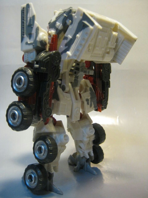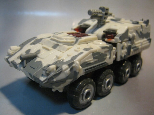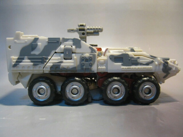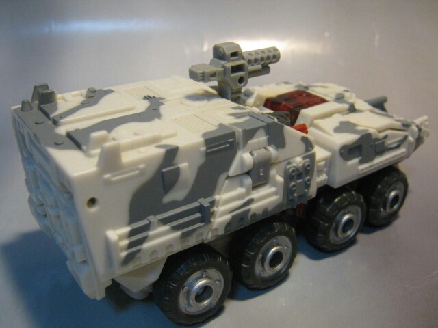 グレーの都市迷彩が施された白い装甲車に変形。8輪のタイヤは一つ一つがちゃんと回ります。上部には銃器も装備されています。