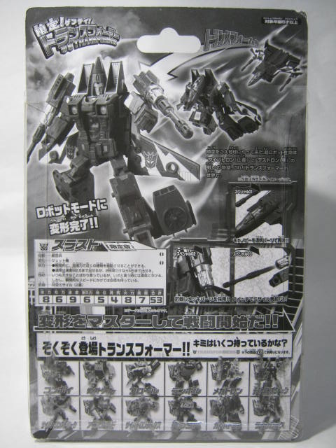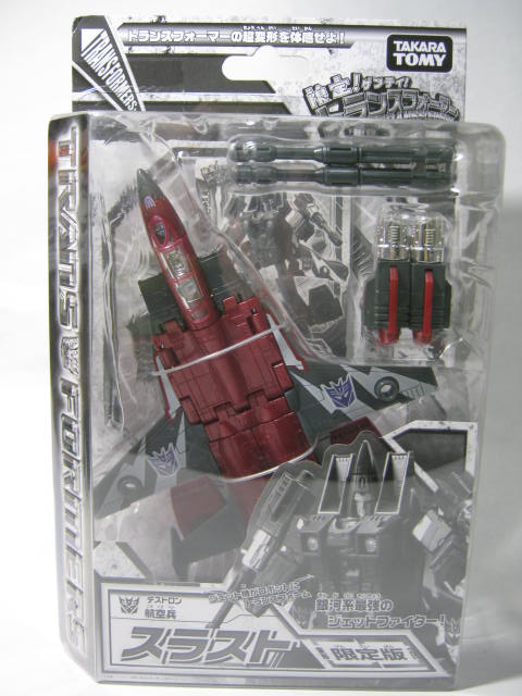 以上、スラストでした。一番好きなジェットロンなだけあってスラスト玩具の中でも欲しかった一品。こうして無事に手に入れる事が出来ました。かれこれ9年近く前の商品なだけあって、今弄ると物足りないと感じる所もありますが、手ごろなサイズでサクサク変形させて遊べるスラストの玩具として優秀な所がありますねー。意外とちゃんとトンガリ頭のスラストの玩具って少なく、G1基準でしっかりデザインされているのも貴重だったりします。