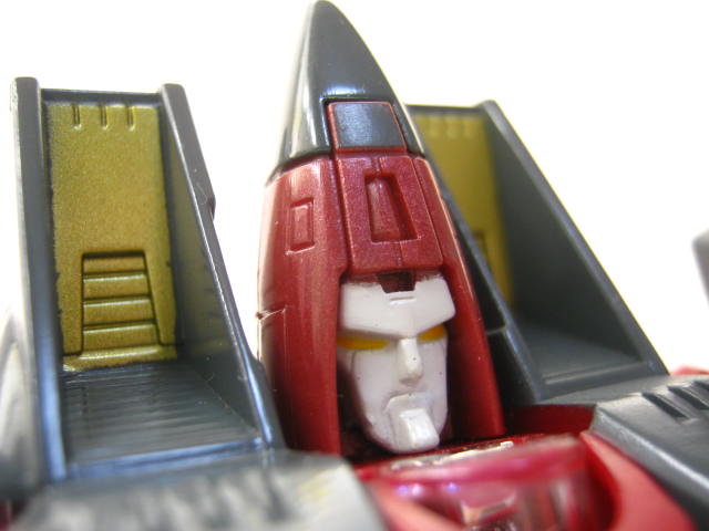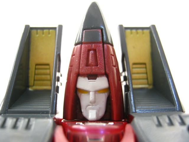 フェイスアップ機首がそのまま頭になっている顏。恐れるべき存在のデストロンなのにこういうマヌケなデザインなのが好きなポイント。サイバトロンのパワーグライドも同じように機首が頭部になりますが、あちらはミニボットなのもあり愛嬌がある。