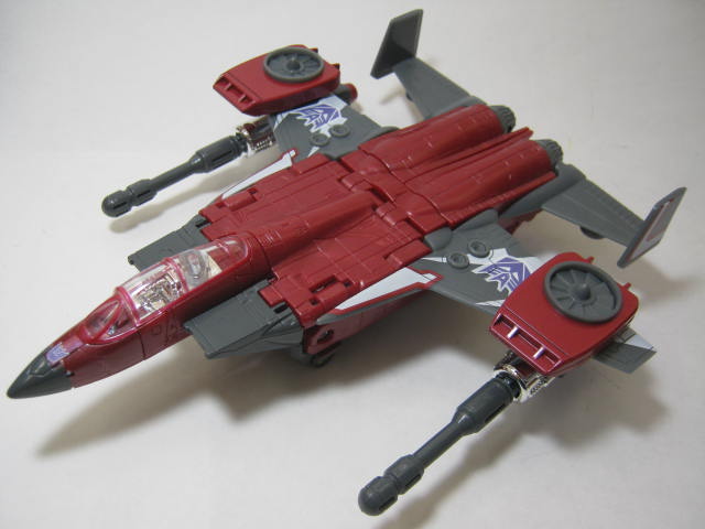 ビークルモード赤いジェット機に変形。G1では主翼に垂直離着陸用のファン(VTOL)が付いていましたが、今回は尾翼の裏に付いています。これについては後述。その為、特徴だったファンが目立たないです。海外公式イベント