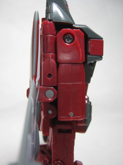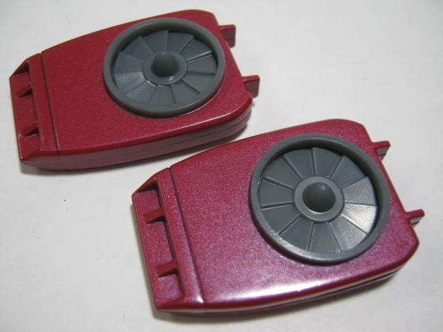 ロボットモードだと裏に配置されるので目立たない。もしかしたら、アニメでは腿横辺りにファンが配置されていたのを指揮して脚に付けたのかも知れない。