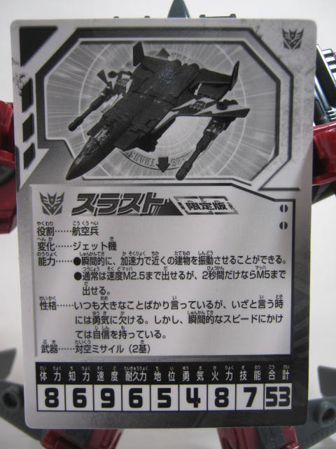 付属のカード。記載内容はパッケージ裏のスペックと同じ。やはり勇気が低め。国内ではこの手のテックスペックカードは今はもうマスターピース位にしか付属しませんねー。