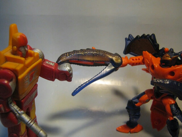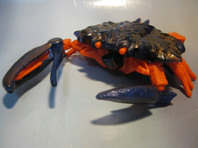 レーザークローは、砂の中に姿を隠し、獲物を狙うのを得意とするデストロン。彼が隠れている場所に敵が近づけば、ハサミで敵を捉えてスパイクで串刺しにする。甲殻は、サイバトロンのセンサーから彼を隠す事な出来る。