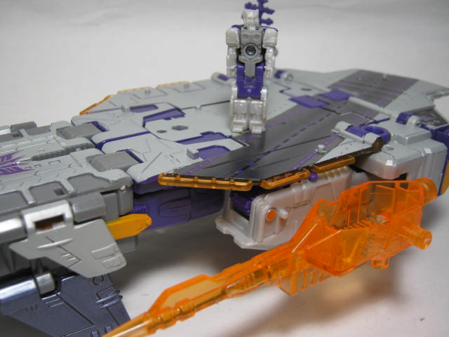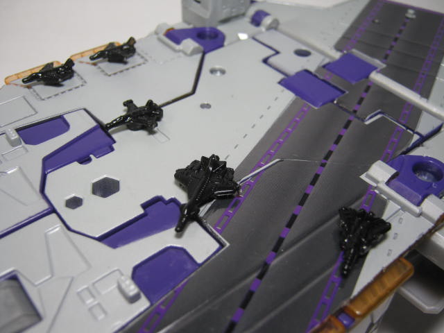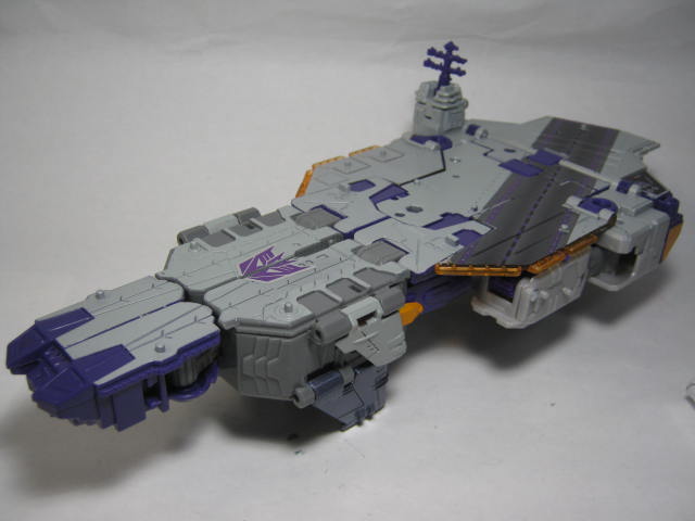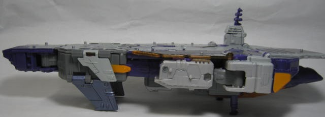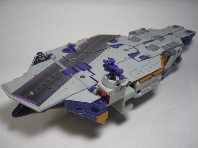 ブロードサイドのリデコですが、リデコされたのは顏であるタイタンマスターのみなのでコチラの形状自体は同じ。元ネタであるアルマダ版では空母、双胴戦艦、揚陸艦の三体が合体した大型戦艦に変形していましたが、今回はあくまでも空母のみの為、分離ギミック等はありません。滑走路やエンブレム等はシール処理。普通にモールドの上から貼られたいたりするので、浮き気味かつズレ気味。