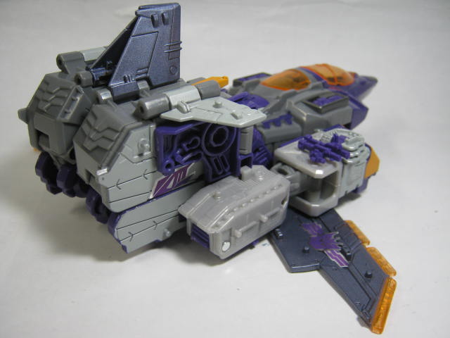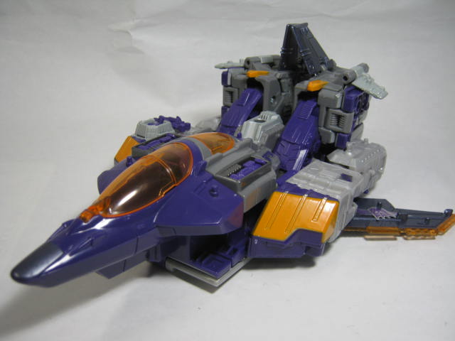 ジェット機モード空母が変形してジェット機とは大きさの概念が良く解りませんが、SFチックなジェット機に変形。正直な所、厚みもあり翼が小さくやや無理矢理気味な形状です。何故か尾翼の向きが逆。しかし肩をクランク移動させたり甲板を折りたたんだりと変形はそこそこ面白い。アルマダ版パートナーミニコンが紫の戦闘機だったのでそれを彷彿とさせて面白い。アニメでは船のまま飛行していたりもしたのでその辺りを含めても意外と似合っているのかも。