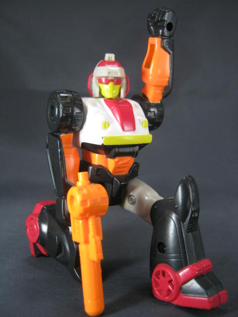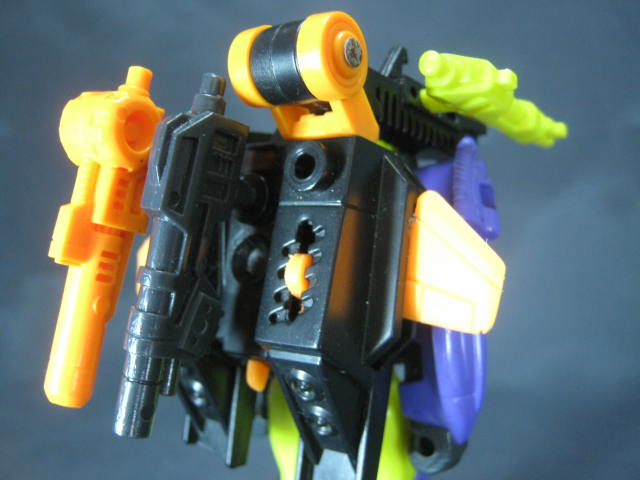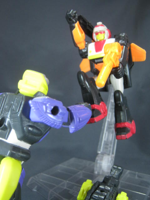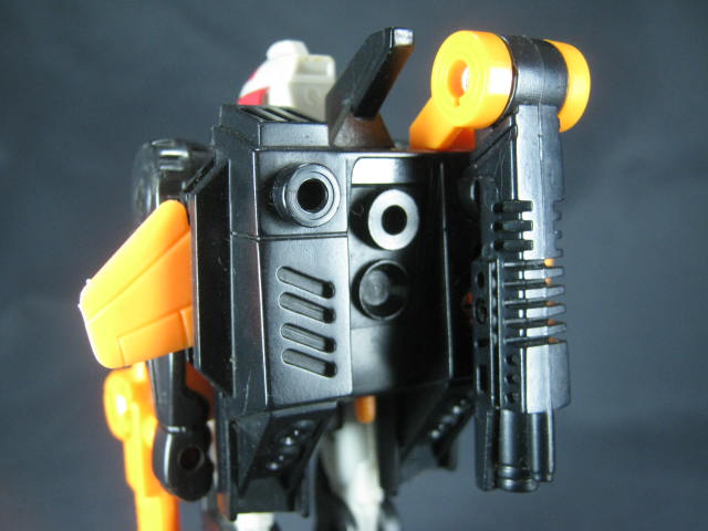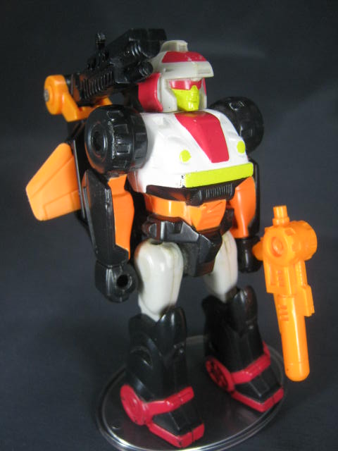 アクションマスターは失った変形能力を補う為のサポートメカが付属。ターボパックは合体時には時速450マイルで走行し、ヒートビームのアタッチメントを持つ空冷式の太陽熱火炎放射器に変形する。キックオフのパートナーはビークルでも動物でも無く、ジェットパック風の装備。このままだと自立も怪しくただ置くだけの感じ。ウィングとか生えてるけど名前や設定的に脚を早くする装備っぽいですね。