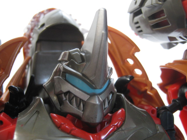 武器は尾がそのまま剣に。何故かプライム版プレダキングの尾のデザインに酷似していますが、コンストラクトボット版のプレダキングにはこのパーツが使われていないので本品の為の新規パーツになるのかな?グリムロック自体、炎を吐いたりするのでこのデザインでも違和感は少ないかも。
