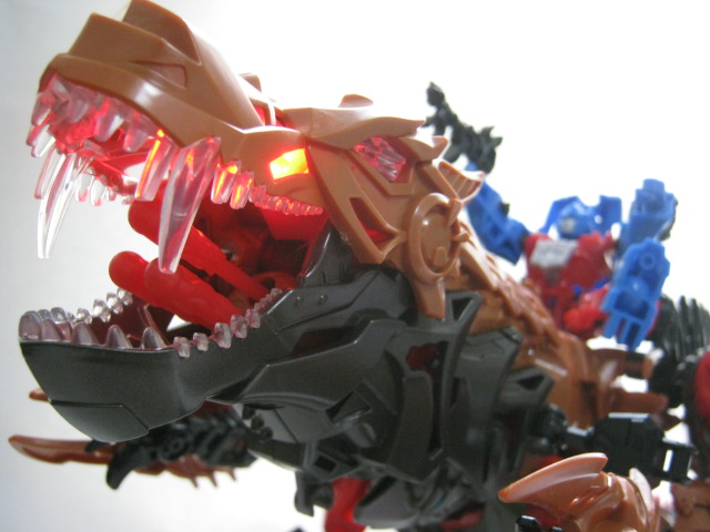 実写の玩具版ではもはやお馴染みと化した銅色のティラノサウルスに変形。オリジナル要素として腕には大型クロー、脚にはミサイルポッド、背中にはブレードが追加されています。