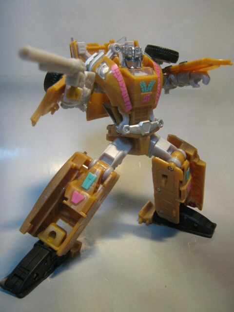カップのリデコなのにかなり様になっているエレクトロン。ボットコン限定品と言う事でなかなか手を出せずにいましたが、思いきって買ってみました。やはり通常のTFと比べて高いので、割高感がありますが初めて触る型だったのもあり結構満足しています。私は元々、G2シリーズそのものやギミック等が好きだったのでG2カラーとかG2キャラを意識したリデコ等の見た目だけを再現したモノはあまり好きではありませんでした。しかし、エレクトロンは破損しやすいG2版と違い気軽に弄る事が出来るし、胴体の回転と腰の伸縮変形等が面白い型なのもあり、かなり気に入っています。