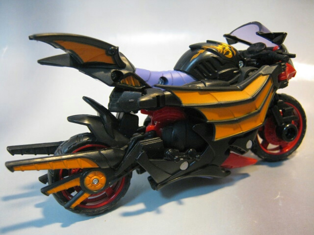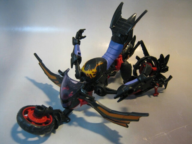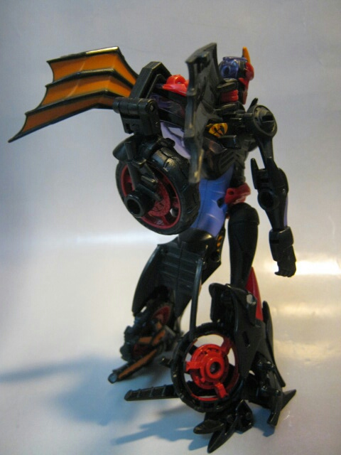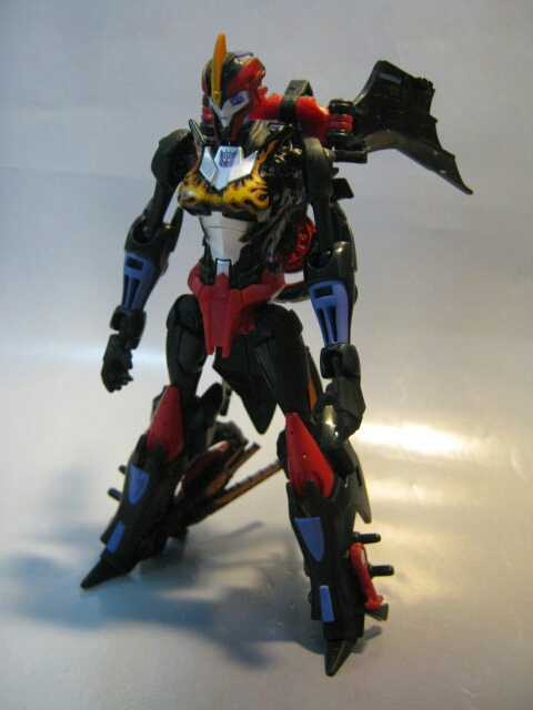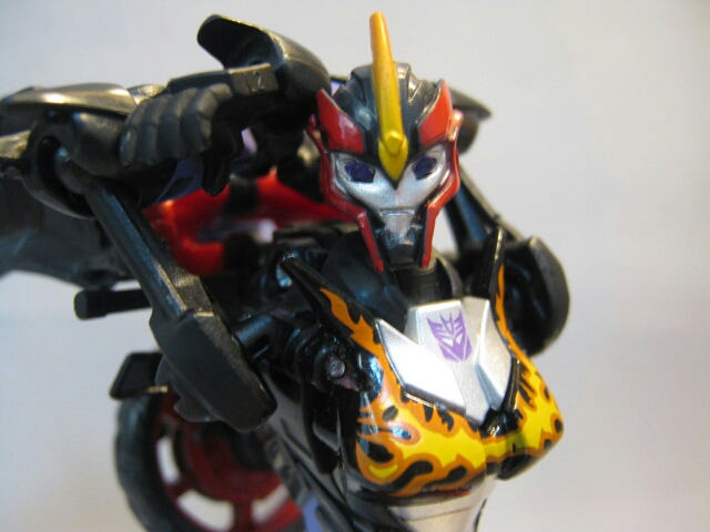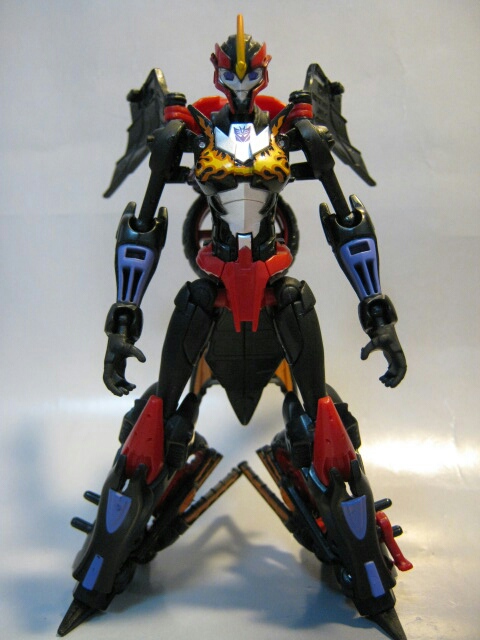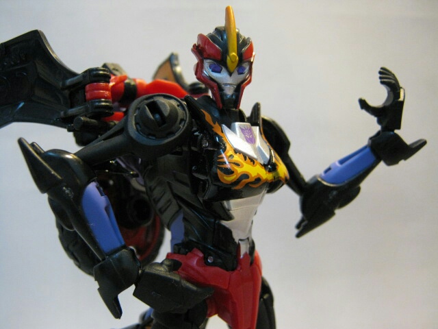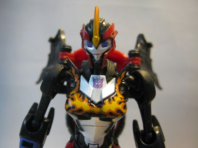 黒と赤のボディにファイヤーパターンが目を引くロボットモード。胸にはディセプティコンのエンブレムがプリントされています。傭兵だからか、スターシーカー専用のエンブレムでない辺り細かいですね。背中の羽が小悪魔チック。