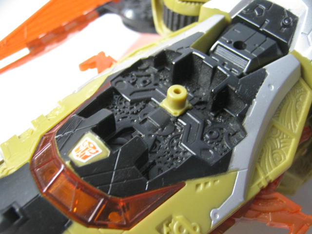 ビークルモードSFビークルに変形。ベクタープライムがプライマスによって作られた最初の13人のTFという設定と時間を操れる能力からか、歯車が多かったり、従来のSFビークルに変形するTFとはまた違った雰囲気があります。リペイント元の通常カラーのベクタープライムは銀、水色(海外版は白)なのに対し、このバージョンは金、オレンジと対照的なカラーリングになっています。ちなみに