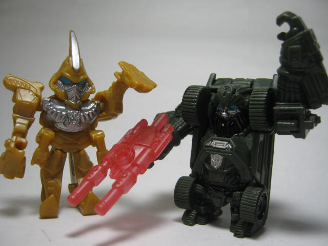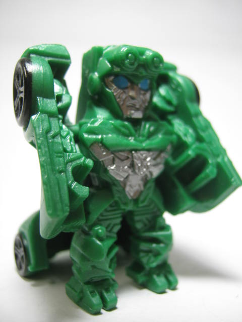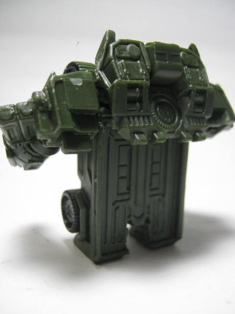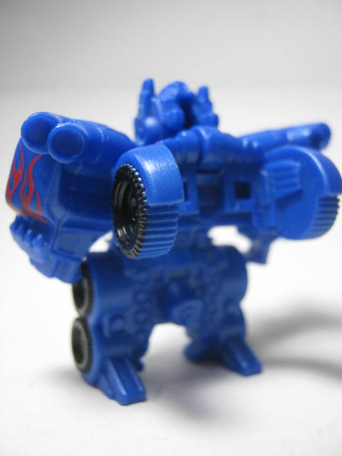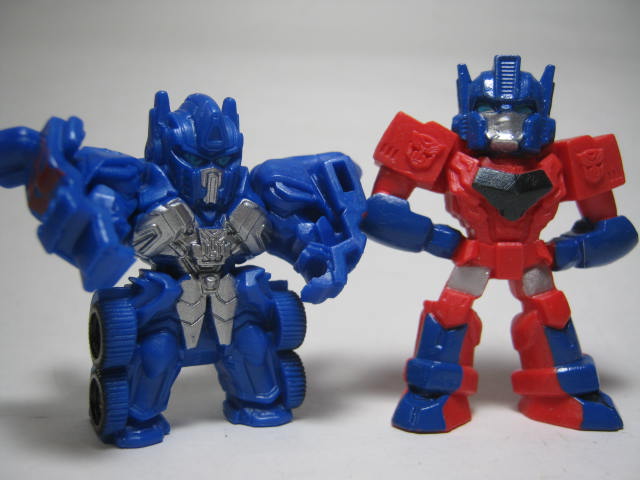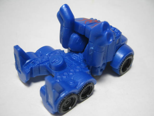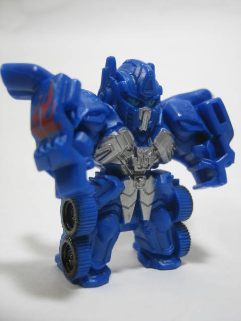 ロボットモードオートボット総司令官。前作で宇宙に旅立つも今回は悪役?として大暴れしそう。上部が腕になってフロントを背中に回せば変形完了。3頭身ほどの姿に変形します。こちらも塗装が最低限の範囲で、劇中とは配色がぜんぜん違くても、それっぽく見える様になっておます。マッシヴな体系で強そうです。全キャラ、胸にエンブレムがモールドされているのは小さいケド、かなり好印象です。