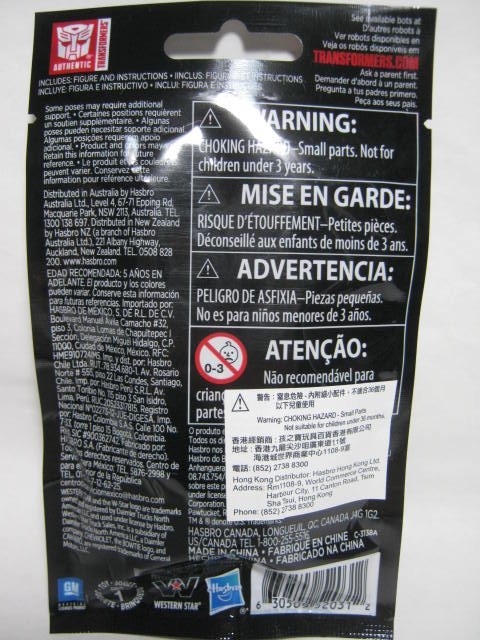 パッケージ中身の見えないブラインドパック。一応、裏面の左下に小さな覗き穴があり、中身をある程度確認出来なくは無いです。表面にはオプティマスとバンブルビーの両形態が載っていますが、肝心な中身の画像が無いのでコレだけだと何なのか伝わらないという難点が。この辺は販売用BOXでカバーしているのかな。