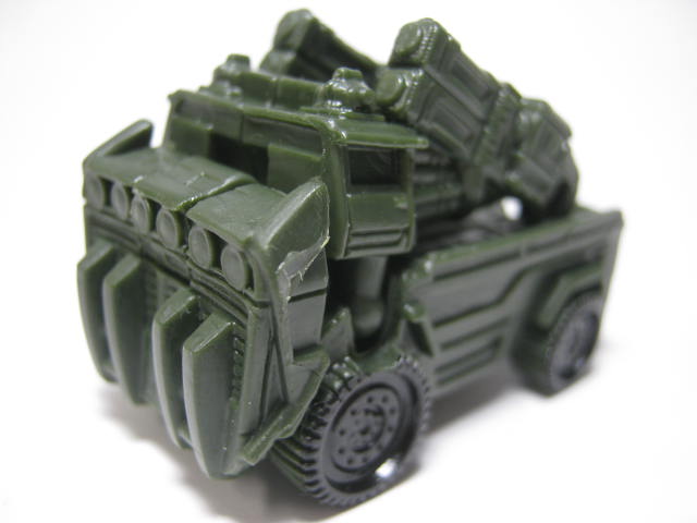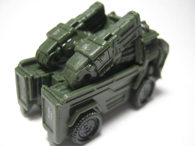 ビークルモード軍用トラック?に変形。ランチャーのようなモノが特徴でラストナイトでの新しいビークルモードの模様。コイツだけややデカくて入っていた袋もパンパンだったし気持ち重かった。色が暗いので塗装の黒が目立ちにくく、やはり寂しい。