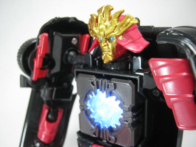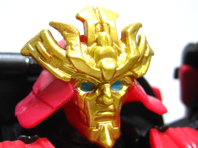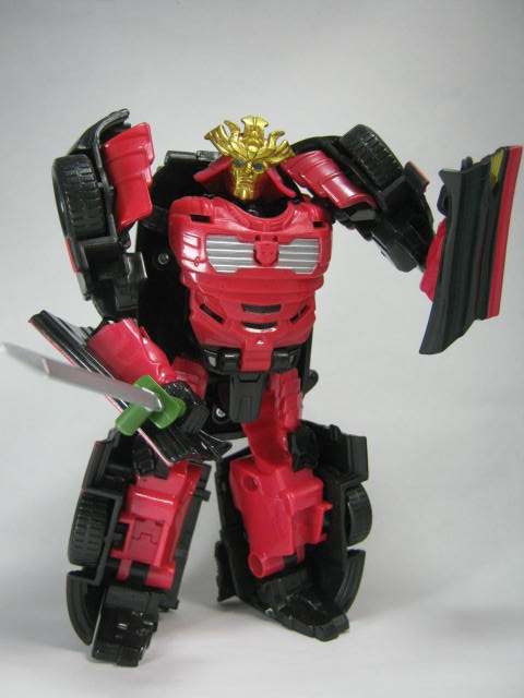 ロボットモード侍風の姿に変形。見た目は青のロストエイジ版では無く最後の騎士王版。共通の変形パターンでありながら、ちゃんとドリフトに見えるのは凄い。頭部は柔軟素材を使用。足首はビークルの正面と言うのもあってか柔軟パーツでは無くなりました。手足の赤は殆どが塗装でなく成型色で出来ているのもいい感じ。