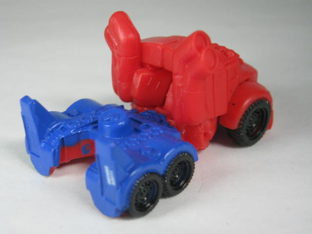 トラックに変形。ビーと違い1~4弾までこの型で皆勤賞。ターゲット限定版含め全てのタイニーターボチェンジャーズシリーズ商品にラインナップされています。今回はG1版をイメージしたスピンオフビー版風カラー。形状がロストエイジ版以降のままなので違和感が凄いですけど。タイヤと後部の青が塗装。タイヤの塗装パターンは3弾以降のモノで全面が塗装されています。最初は多色形成とか期待したんですけど、普通に青い部分は塗装でした。おかげで塗装面積はトップクラスなんですけどね。